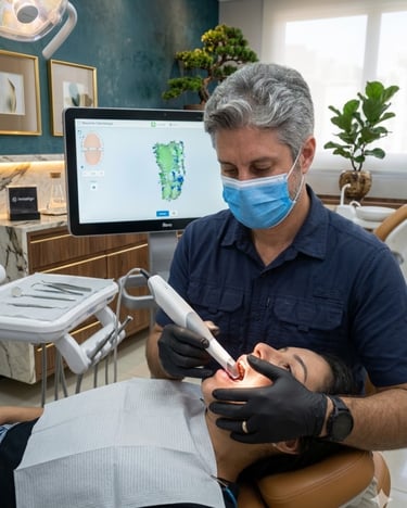 Com ele, conseguimos criar uma cópia digital de toda sua boca, registrando dentes tortos ou quebrados, cáries, próteses, posição de mordida, etc.